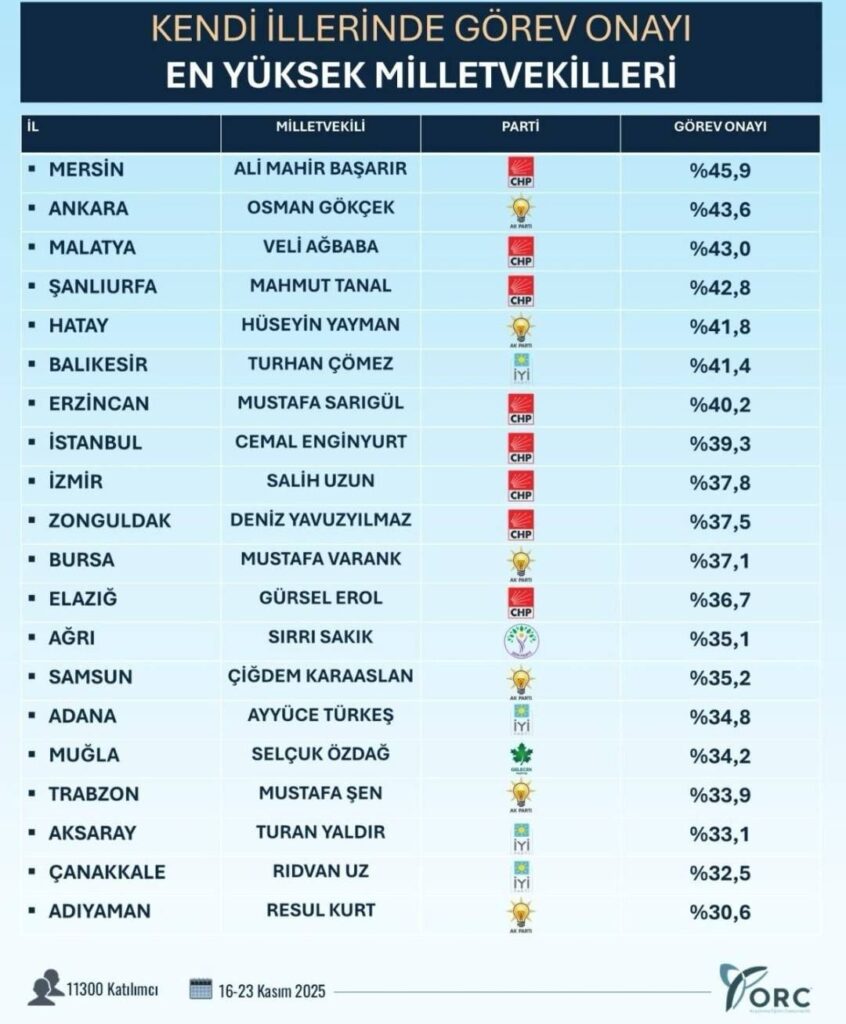16–23 Kasım 2025 tarihleri arasında 11.300 katılımcıyla yapılan araştırmada, seçmenlere “Kendi ilinize hizmet eden milletvekillerinin görev performanslarını nasıl değerlendiriyorsunuz?” sorusu yöneltildi.
